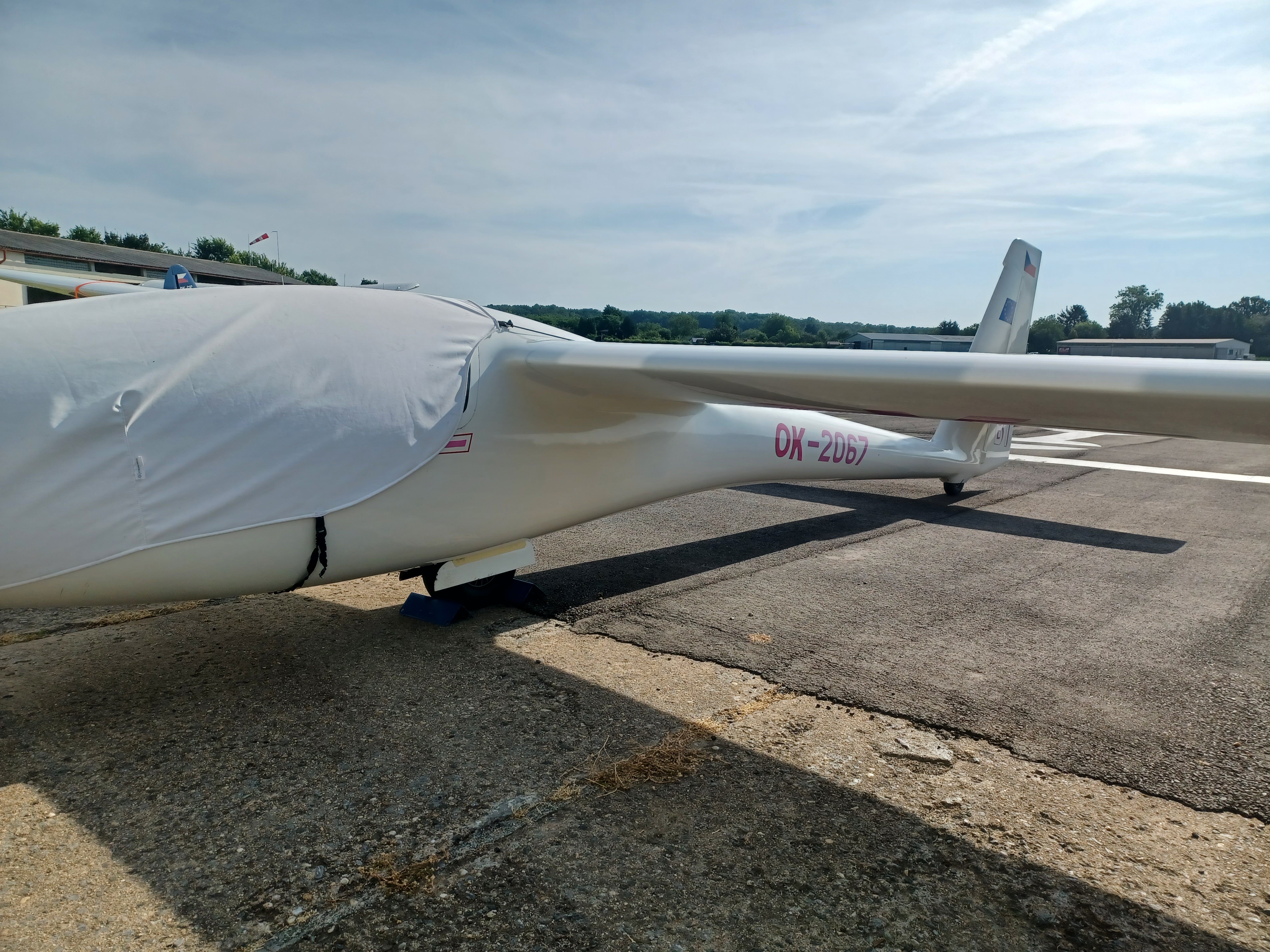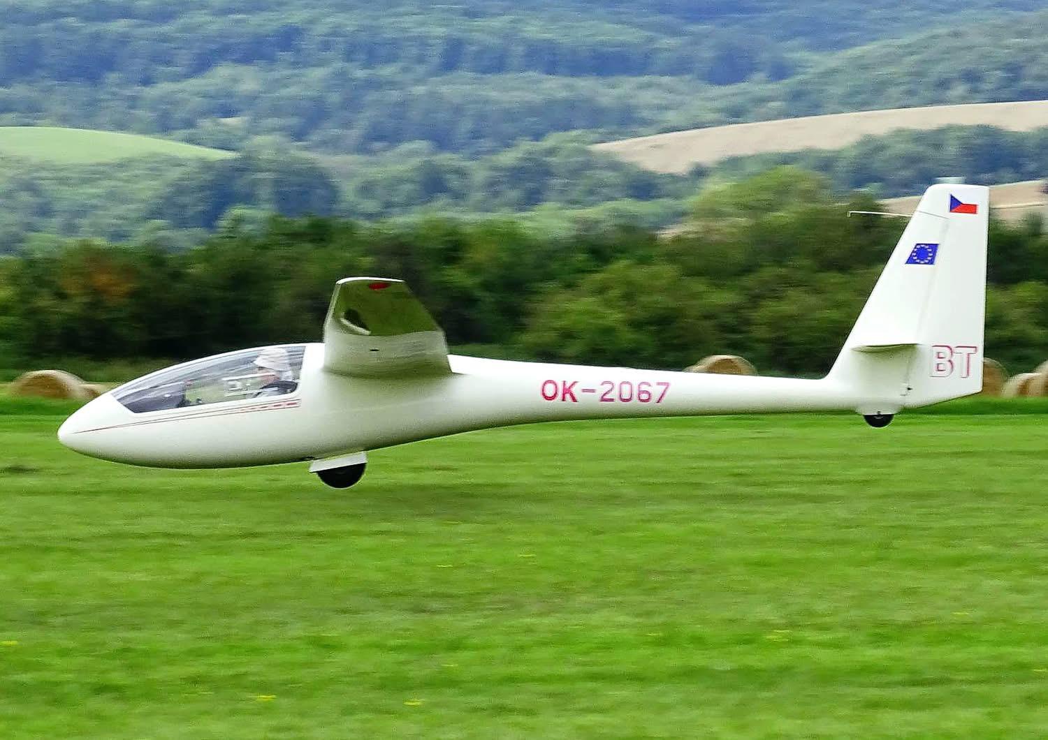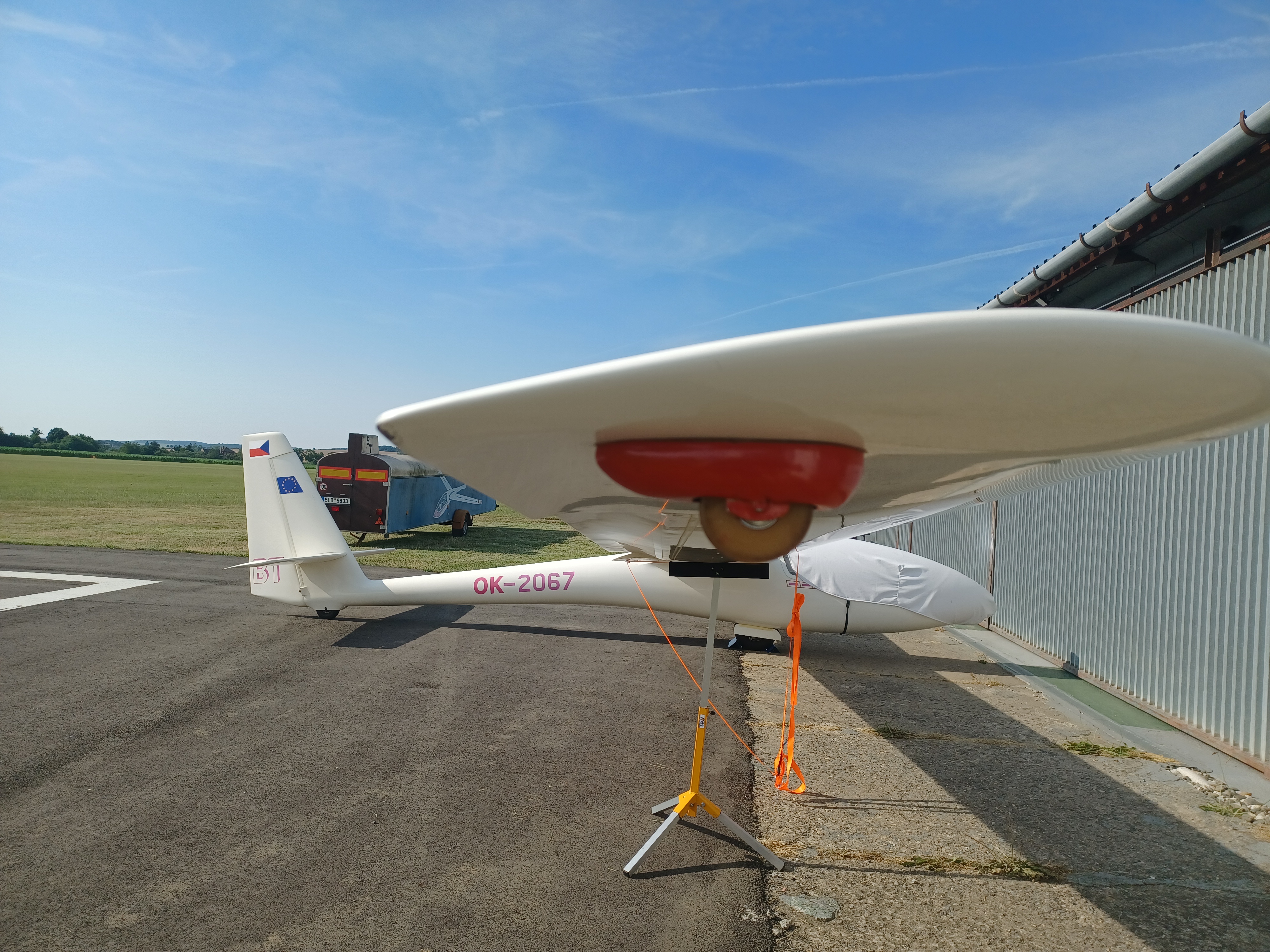 Zadní kolečko a malá kolečka na koncích křídel usnadňují pohyb po zemi.